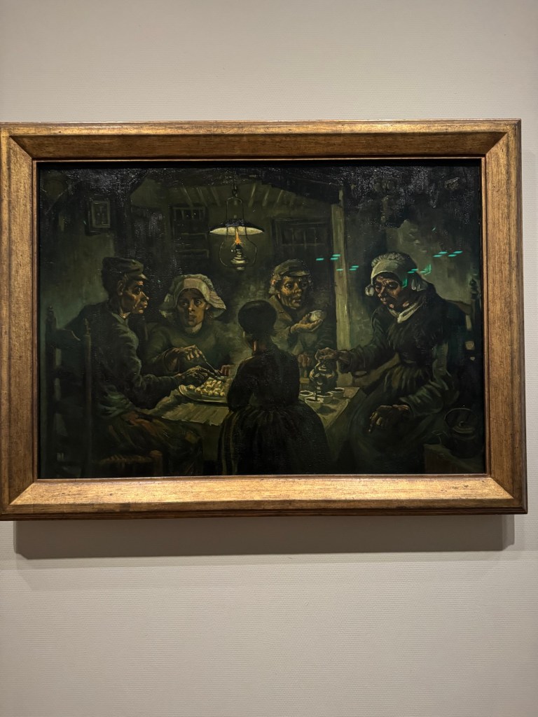 Standing in front of his famous bedroom painting and being exposed to its lively brightness is a unique experience. If you look closely, the composition does not have shadows. Other works have many dark themes, grey colours, and shadows, like his “potato paintings,” where he wanted to highlight the men and women of the land. However, he was much criticised for these paintings.